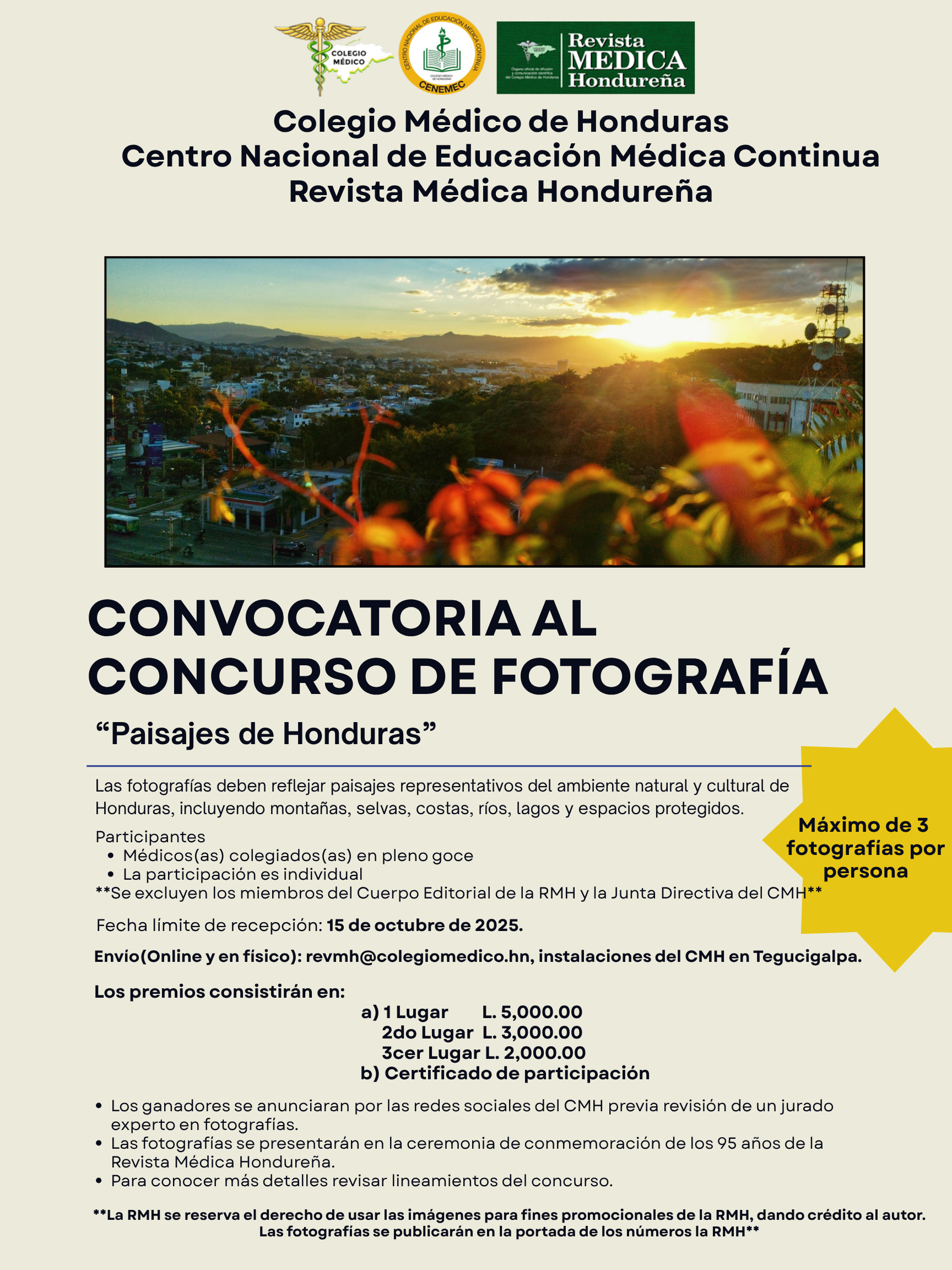 La Revista Médica Hondureña (RMH), en el marco de su 95 aniversario, lanzó la convocatoria al concurso de fotografía "Paisajes de Honduras", dirigido a médicos colegiados en pleno goce de sus derechos y apasionados por la fotografía. Inicialmente, la fecha límite de envío fue el 10 de octubre, pero se extendió la fecha hasta el 15 de octubre.